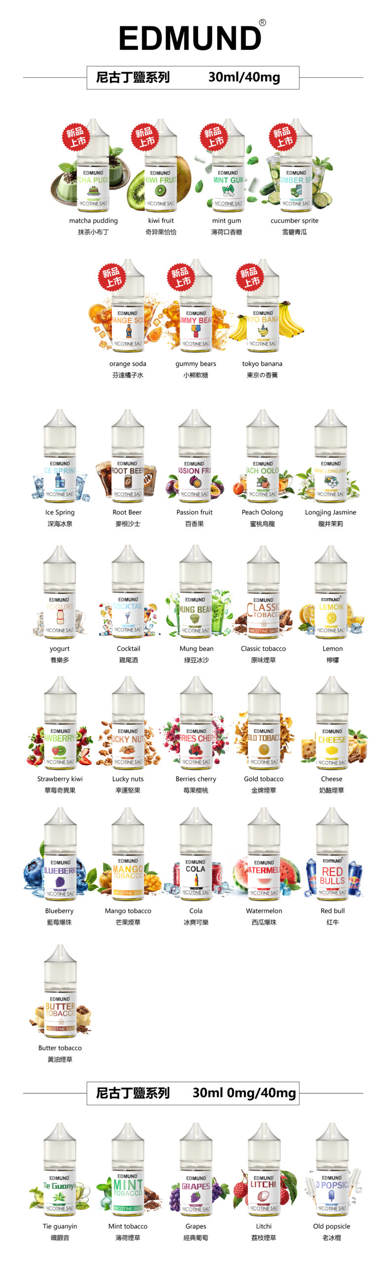 感受来自EDMOUND 欧姆电子烟烟油的激情与创新。每瓶30ml的容量搭配40mg的丁盐,为您带来前所未有的顺滑口感和满足的喉咙刺激。