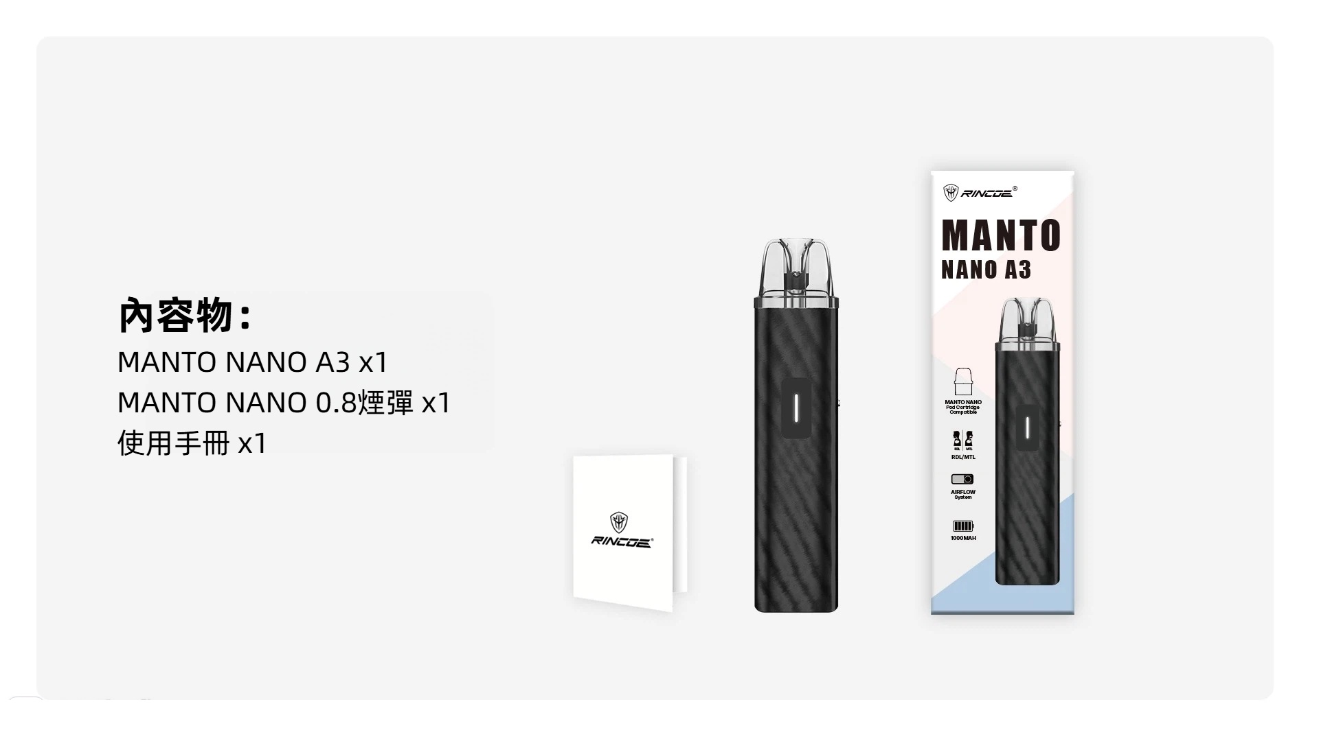 Rincoe Manto Nano A3 是一款主打輕量化、穩定輸出與高相容性的隨身小煙,無論是日常通勤、初學者入門,或是想找一台耐用機的使用者,A3最剛好的吸感與便利性。透過多種口味彈與可靠的續航表現,它成功把「簡單但不簡陋」的理念發揮到位,是近期同級產品中非常值得入手的一款。